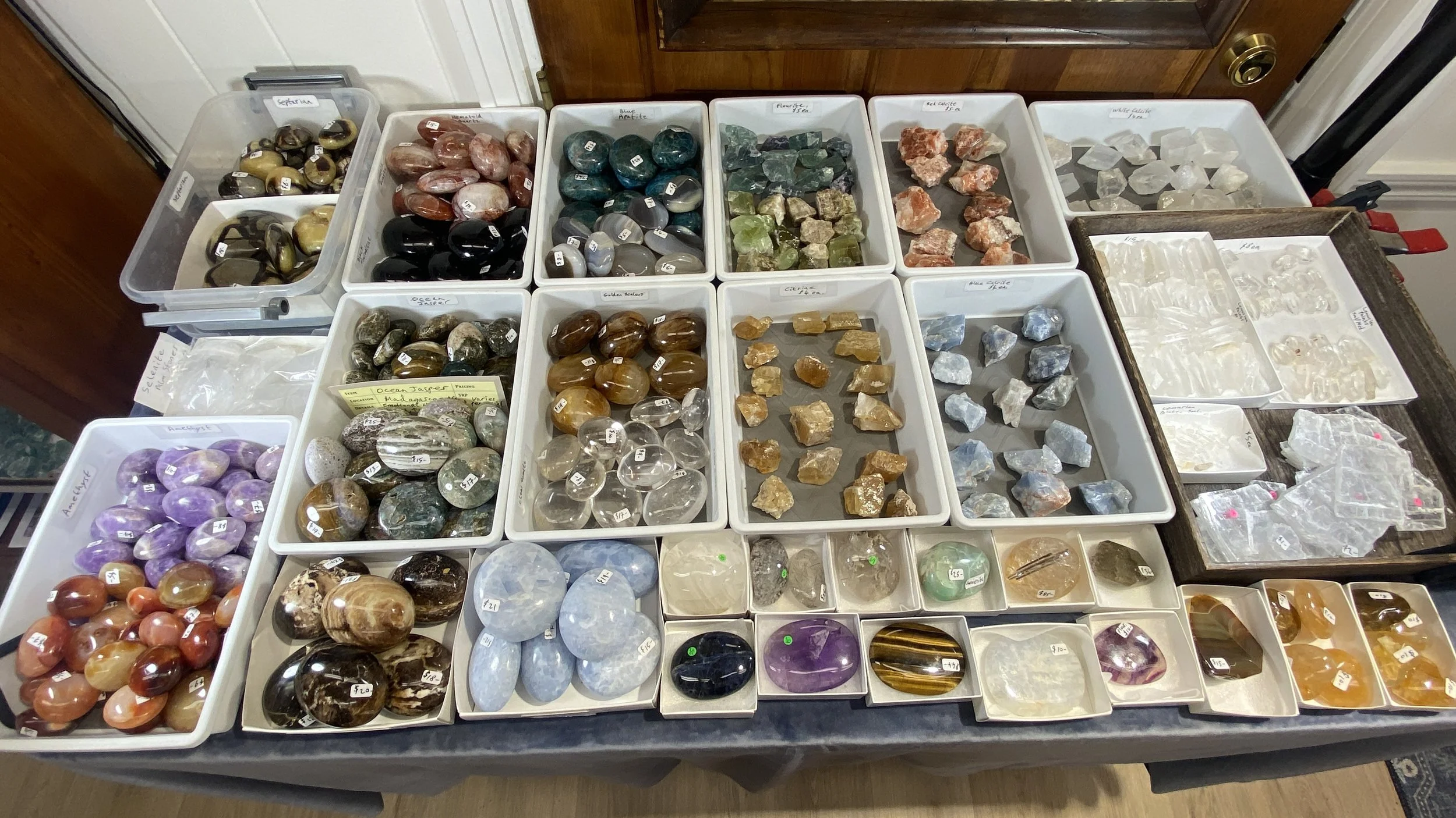 Clear Quartz, Lemurian quartz, Fluorite, Citrine, Selenite, Swiss Alpine quartz, Ganesh Himalayan quartz, Garden / Included quartz, Rutilated quartz, Quartz with Tourmaline, Quartz with Green Epidote, Arkansas quartz.